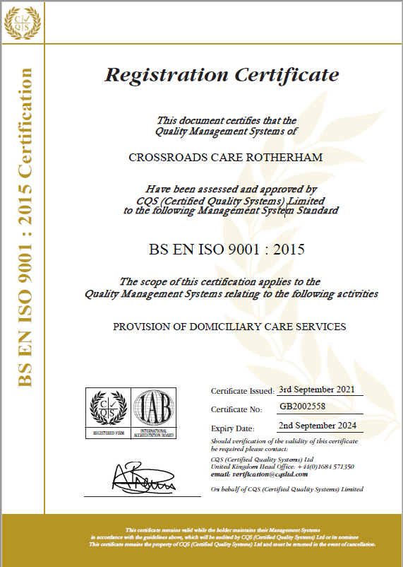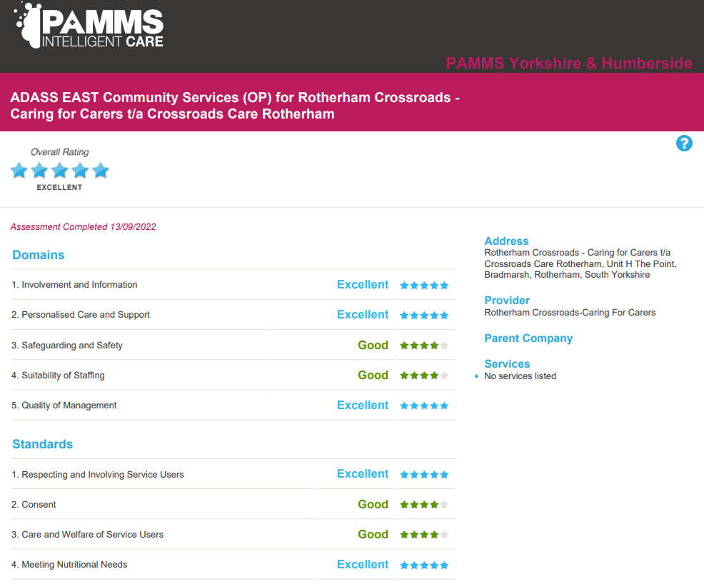 Quality of care is essential to Crossroads. We pride ourselves in delivering high quality services and have a commitment to continual improvement. We have been rated OUTSTANDING by Care Quality Commission and EXCELLENT by PAMMS Intelligent Care.